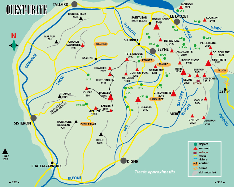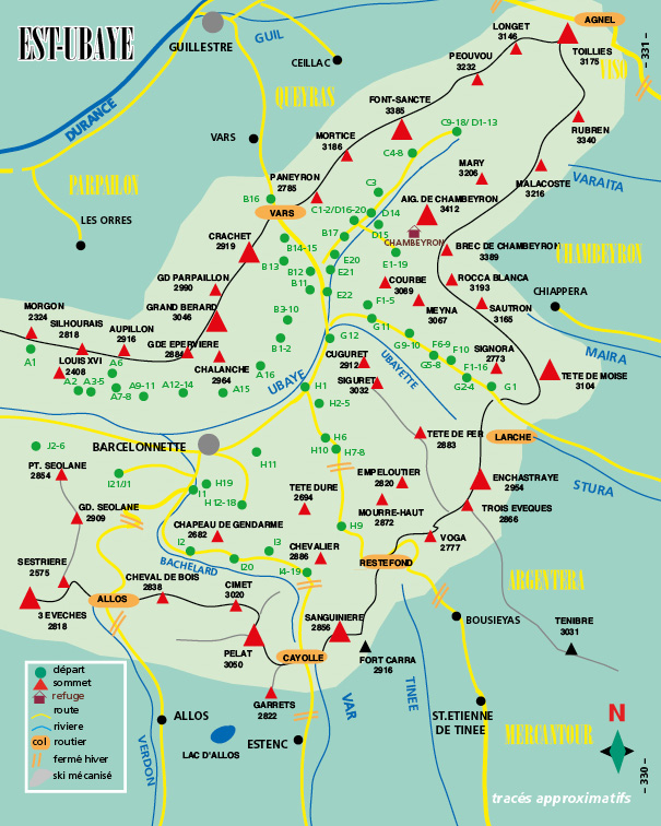 – Principaux groupes : Morgon, Grand Bérard, Parpaillon, Mortice, Font-Sancte, Toillies, Rubren, Chambeyron, Sautron, Moïse, Enchastraye, Siguret, Restefond, Sanguinière, Pelat, Seolane, Estrop, Blayeul, Monges. Un chapitre Hautes-Routes permet de découvrir confortablement les vallées de l’Ubaye et des massifs voisins.