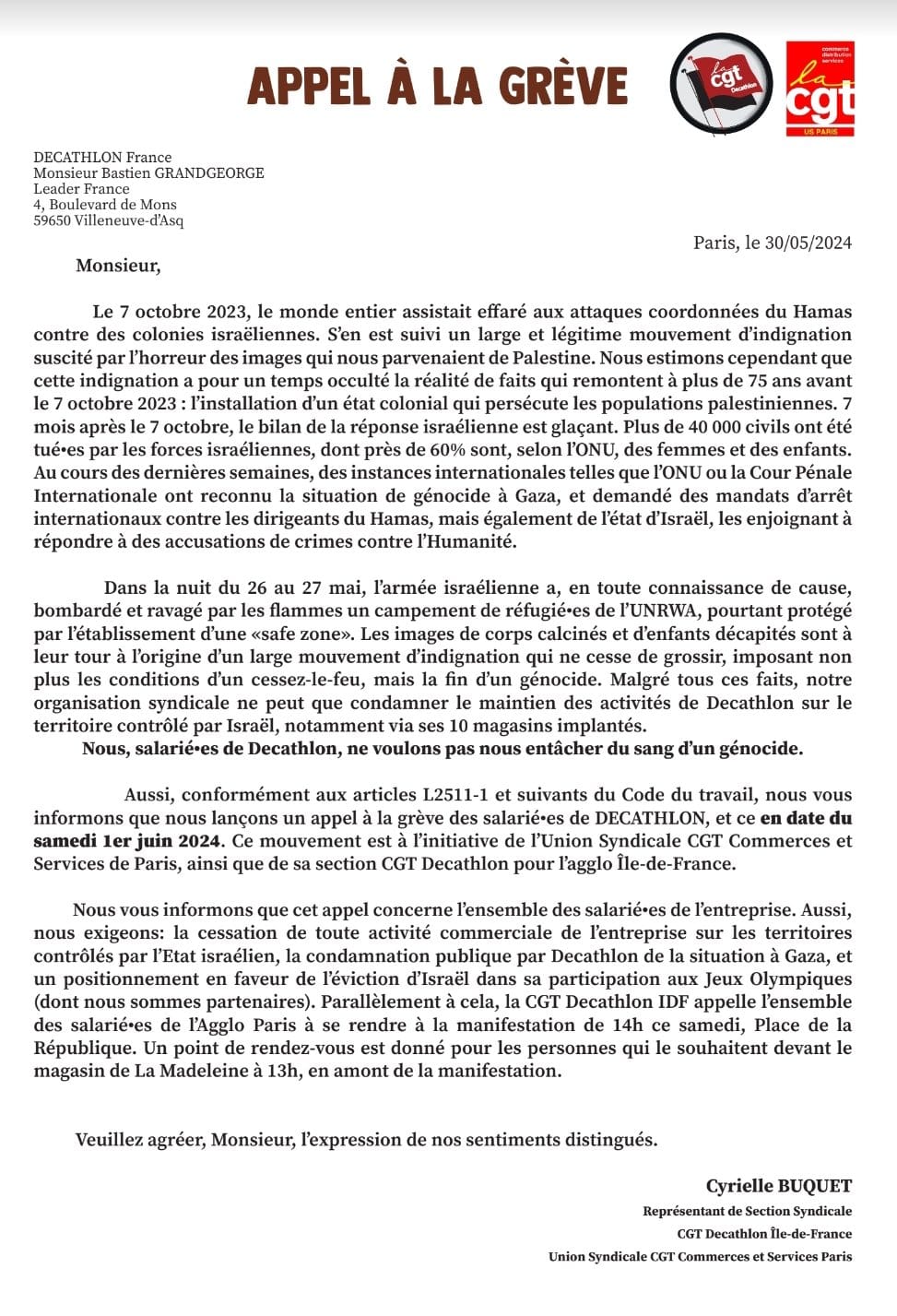 A relever aussi cet appel de la CGT Décathlon à supprimer les entreprises du groupe en Palestine occupée.