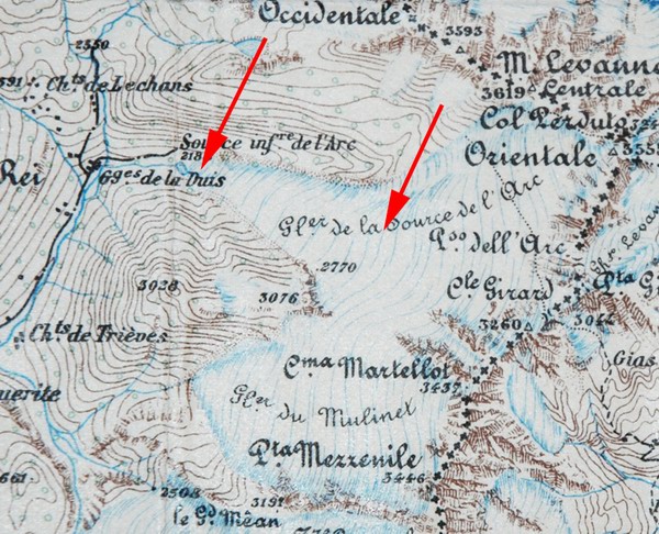 elle correspond à la flèche du bout du glacier de la carte de 1921
