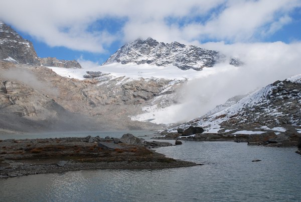Photo prise devant la moraine de dépose frontale limite du glacier lors de la fin du petit âge glaciaire (1900), altitude 2100 m,
