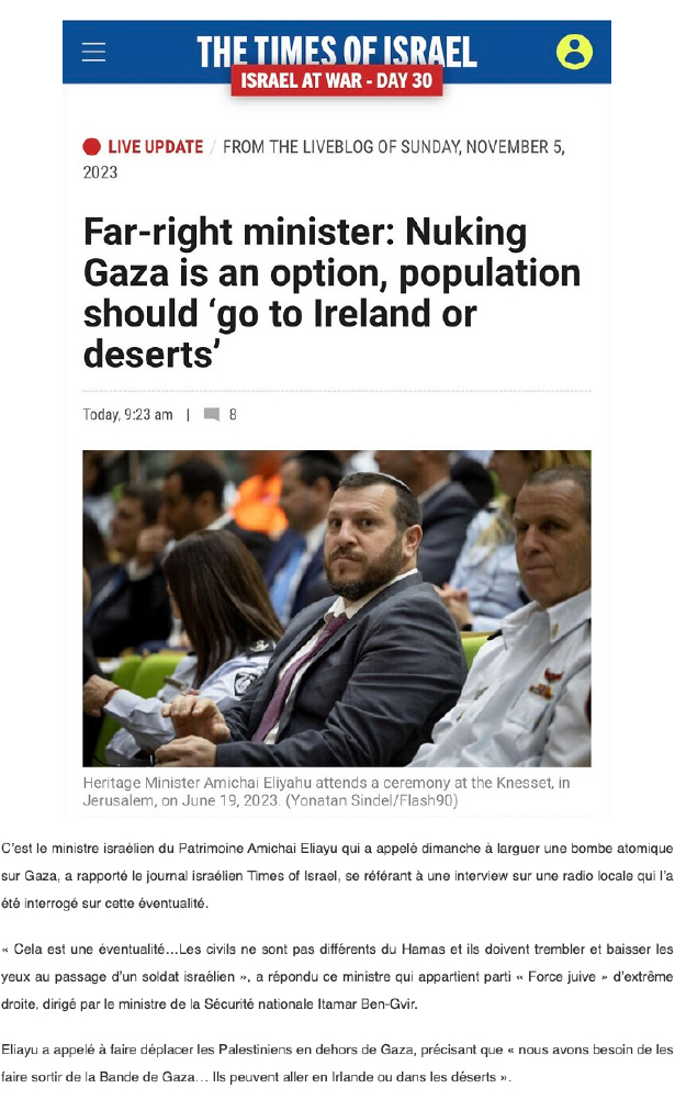 En Palestine occupée dite "Israel", le ministre du Patrimoine a demandé le bombardement atomique de Gaza suivi de la déportation de ses habitants. Le président Herzog avait déjà défini la marche génocidaire : "pas d’innocents à Gaza". On sent bien que cette engeance délire : plus radicale sera sa destruction.