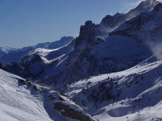 Le dernier épisode neigeux n’a pas apporté de couche miraculeuse même si le blanc descendu bas (1300m) cache bien visuellement la misère du début d’hiver.J’ai mesuré dans Montbrison 5cm à 1700 ce qui permet de skier sur les pistes forestières ou les prés mais pas en tout terrain ; 20cm à 2600m ce qui donne une excellente skiabilité sur la vieille sous couche. Mais il y a un hic majeur : un vent terrible du nord...renversant au sens propre, décape les crêtes et les pentes exposées pour former des plaques redoutables (déja 2 morts aujourd’hui).C’est une configuration normale des débuts d’hiver mal enneigés mais la plus grande vigilance est indispensable. Le Briançonnais malgré l’insuffisance de l’enneigement de fond est dangereux sur de nombreuses classiques de bon niveau. Beaucoup de choses sont faisables mais tout n’est pas permis.
