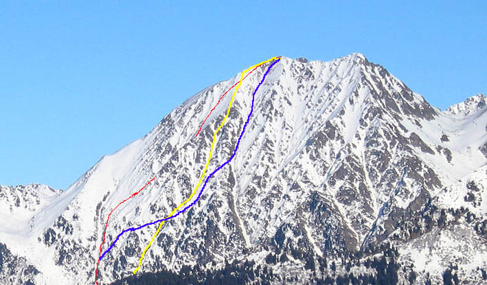 A la montée j’ai suivi le tracé jaune et à la descente le tracé bleu (11h15, la neige était encore dure). Le couloir central n’est pas très raide, la moitié inférieure est plus