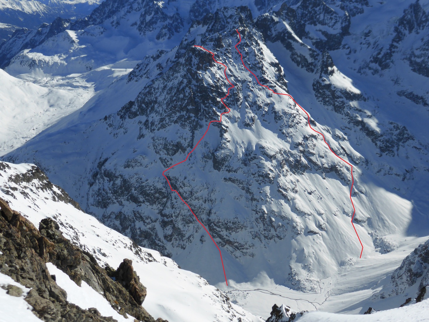 – 18/04/19, Enchaînement des Ailefroides Occidentale 3954m et Orientale 3847m. Ailefroide Occidentale, couloir SSE, 1 désescalade de 5m, 1 rappel de 50m pour rejoindre l’Orientale, 400m, 5.1 / E2. Ailefroide Orientale, face SE, combinaison des itinéraires, Au-dessus du vide les fantoches s’agitent, Le Perchoir (à la montée), le versant SE depuis les corniches et du couloir E, 2 désescalades de 3m et 10m, 4 rappels de 20m, 45m, 15m et 20m ; 650m, 5.1 / E3 pour la partie au dessus des barres rocheuses